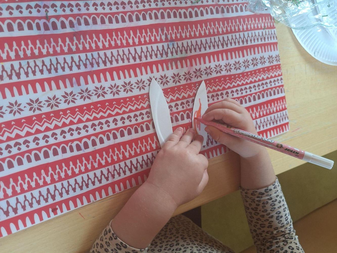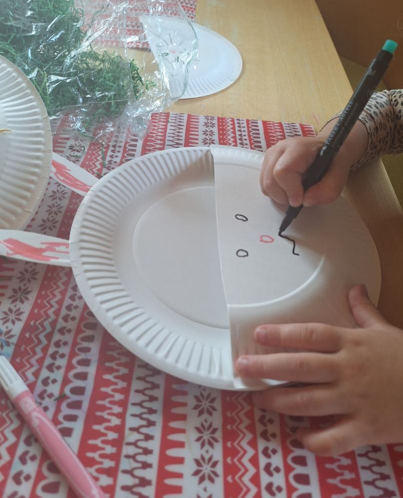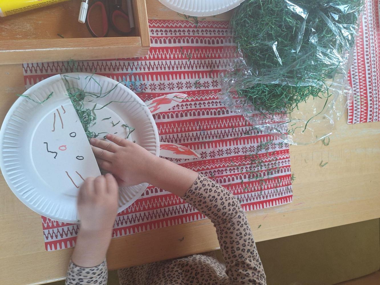 Gemeinsam bastelten wir mit den Kindern Osternester. Dabei verwendeten wir Pappteller, eine Schere, Filzstifte, Naturbast und Ostergras. Wir haben von einem der beiden Pappteller ca. ein Drittel weggeschnitten. Ein Osterhase hat auch noch Ohren, Augen, Nase und Mund. Dabei konnten die Kinder sehr kreativ sein. Danach klebten wir beide Pappteller zusammen und füllten das Osternest mit Ostergras, einem selbst gefärbten Osterei und einem kleinen Schokoladenosterhasen.