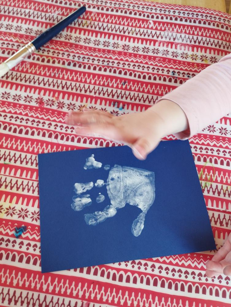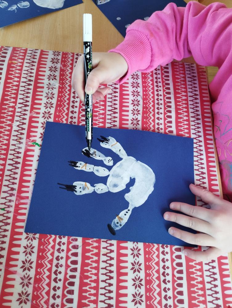 Dieses Jahr gestalteten wir im Kullapup mit den Kindern Schneemänner. Passend zu einem beliebten Schneemannlied, welches die Kinder freudig mit uns singen. Zu Beginn wurde jedem Kind die Hand bemalen. Viele hatten Spaß daran, sich selbst die Farbe auf der Hand zu verteilen. Anschließend wurde der Handabdruck gemacht. Danach wurden auf dem Bild verschiedene Schneemänner gezeichnet. Dabei konnten die Kinder ihre individuellen Schneemänner gestalten. Am Schluss konnte jedes Kind das fertige Bild selbstständig in die Portfoliomappe einsortieren. Die Kinder hatten Spaß in ihrem Tun und konnten wertvolle Erfahrungen im Bildungsbereich Ästhetik und Gestaltung sammeln.