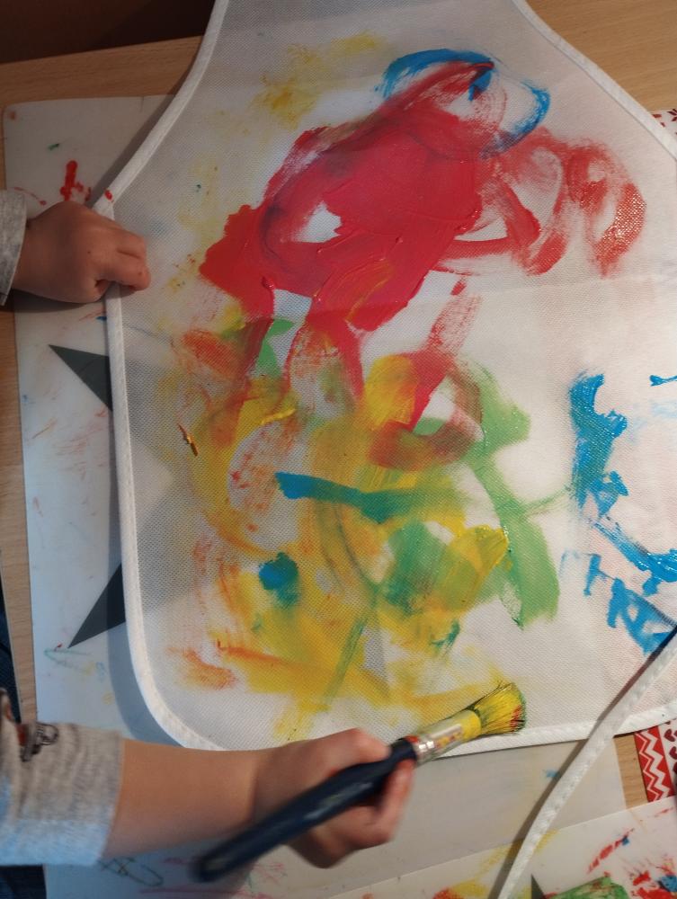 Zuerst hat sie mit ihnen eine Schürze bemalt.