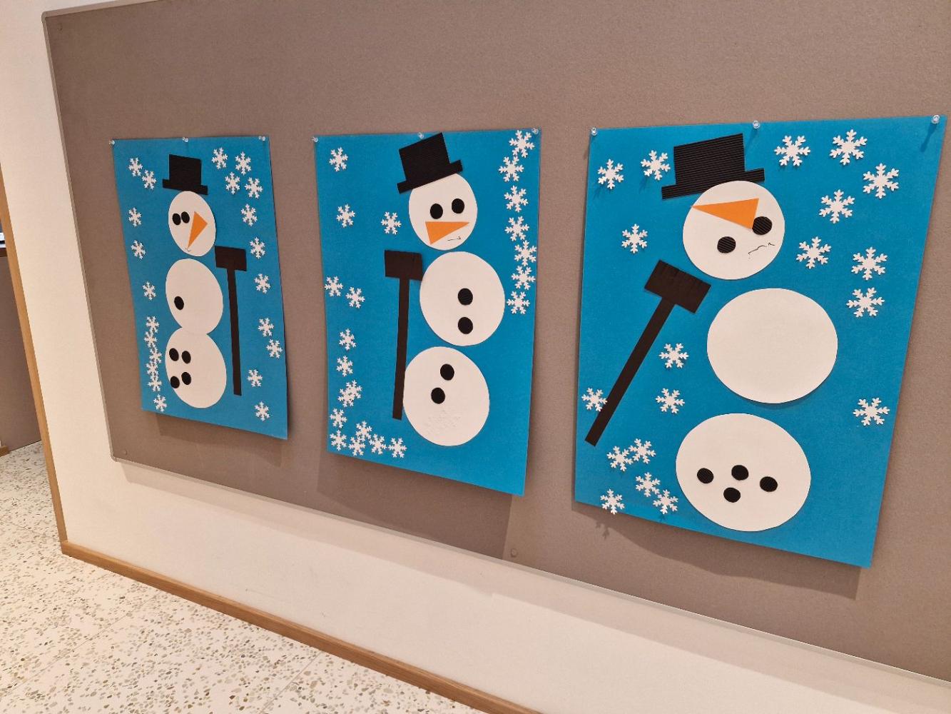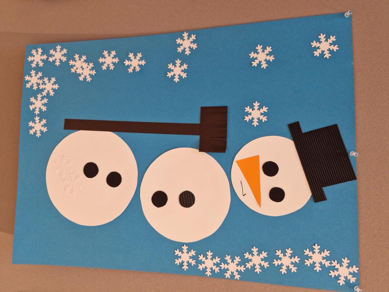 Gemeinsam haben wir in Gruppenarbeit mit viel Eifer und Kreativität an einem großen Schneemannbild gearbeitet. Aus runden Papierkreisen entstand der Körper, welche wir dann mit Augen, einer Karottennase, einem Mund, Knöpfen, einem Hut und einem Besen zum Leben erweckt haben.